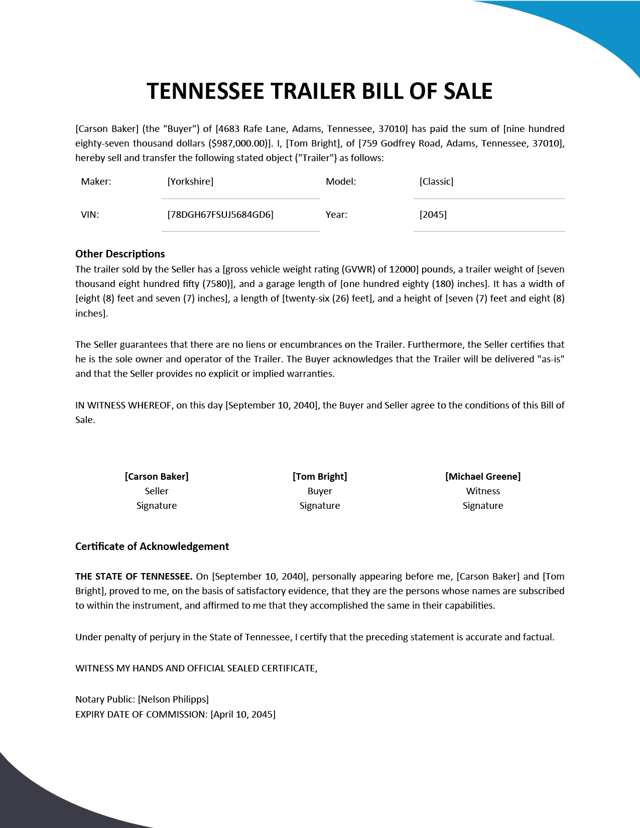 Tennessee Trailer Bill of Sale Template Fill Out, Sign Online and