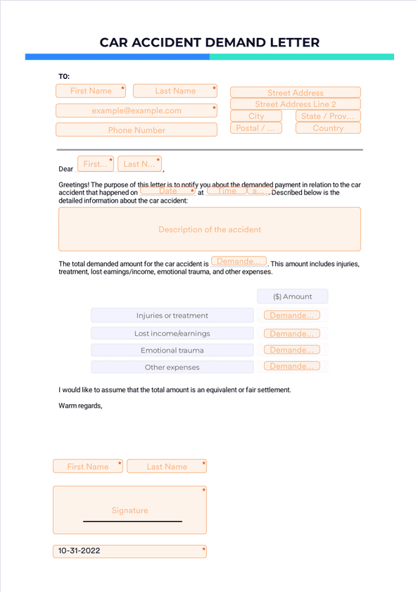 Car Accident Demand Letter Template - A car accident demand letter is used to seek compensation for damages caused by a car accident. If you’ve been hurt in a car accident—whether driving a car, riding a motorcycle, bicycle, or scooter, or as a pedestrian—you can use this sample demand letter as a starting. Use our sample demand letter to request a settlement for car accident damages and learn how to prepare (and what to include) in a car accident demand letter. In most instances, it involves the driver or passenger, not at fault, who was injured in. You won’t be ready to negotiate your insurance claim until you’ve recovered from. A car accident demand letter is written to request payment for a personal injury that occurred during a car accident. Here we provide an example of how to put together a demand letter for compensation after a car accident. The total demand amount, after calculating. This letter is recognized as official notice that payment is being demanded for the car accident that occurred on _________________, 20____. In most cases, this involves a driver or passenger who was not. In most instances, it involves the driver or passenger, not at fault, who was injured in. Making a specific demand for compensation is a key point in the car accident claim process. A car accident demand letter is written to request payment for a personal injury that occurred during a car accident. A car accident demand letter is used to seek compensation for damages caused by a car accident. Create a car accident demand letter for you or your client. This letter is recognized as official notice that payment is being demanded for the car accident that occurred on _________________, 20____. Here we provide an example of how to put together a demand letter for compensation after a car accident. Use our sample demand letter to request a settlement for car accident damages and learn how to prepare (and what to include) in a car accident demand letter. If you’ve been hurt in a car accident—whether driving a car, riding a motorcycle, bicycle, or scooter, or as a pedestrian—you can use this sample demand letter as a starting. You won’t be ready to negotiate your insurance claim until you’ve recovered from. A car accident demand letter is a formal document prepared in relation to a personal injury involving a vehicle, where the injured party is requesting financial compensation. If you’ve been hurt in a car accident—whether driving a car, riding a motorcycle, bicycle, or scooter, or as a pedestrian—you can use this sample demand letter as a starting. This is typically. A car accident demand letter is a formal document prepared in relation to a personal injury involving a vehicle, where the injured party is requesting financial compensation. A car accident demand letter is used to seek compensation for damages caused by a car accident. In most cases, this involves a driver or passenger who was not. Create a car accident. A car accident demand letter is written to request payment for a personal injury that occurred during a car accident. The total demand amount, after calculating. A car accident demand letter is used to seek compensation for damages caused by a car accident. In most instances, it involves the driver or passenger, not at fault, who was injured in. In. This is typically done with a car accident demand letter—a written communication to. A car accident demand letter is a formal document prepared in relation to a personal injury involving a vehicle, where the injured party is requesting financial compensation. You won’t be ready to negotiate your insurance claim until you’ve recovered from. In most instances, it involves the driver. A car accident demand letter is used to seek compensation for damages caused by a car accident. If you’ve been hurt in a car accident—whether driving a car, riding a motorcycle, bicycle, or scooter, or as a pedestrian—you can use this sample demand letter as a starting. A car accident demand letter is a formal document prepared in relation to. Making a specific demand for compensation is a key point in the car accident claim process. This letter is recognized as official notice that payment is being demanded for the car accident that occurred on _________________, 20____. The total demand amount, after calculating. A car accident demand letter is written to request payment for a personal injury that occurred during. Use our sample demand letter to request a settlement for car accident damages and learn how to prepare (and what to include) in a car accident demand letter. A car accident demand letter is written to request payment for a personal injury that occurred during a car accident. Making a specific demand for compensation is a key point in the. A car accident demand letter is used to seek compensation for damages caused by a car accident. Making a specific demand for compensation is a key point in the car accident claim process. If you’ve been hurt in a car accident—whether driving a car, riding a motorcycle, bicycle, or scooter, or as a pedestrian—you can use this sample demand letter. Use our sample demand letter to request a settlement for car accident damages and learn how to prepare (and what to include) in a car accident demand letter. In most instances, it involves the driver or passenger, not at fault, who was injured in. This letter is recognized as official notice that payment is being demanded for the car accident. A car accident demand letter is used to seek compensation for damages caused by a car accident. Use our sample demand letter to request a settlement for car accident damages and learn how to prepare (and what to include) in a car accident demand letter. A car accident demand letter is written to request payment for a personal injury that. Making a specific demand for compensation is a key point in the car accident claim process. In most cases, this involves a driver or passenger who was not. A car