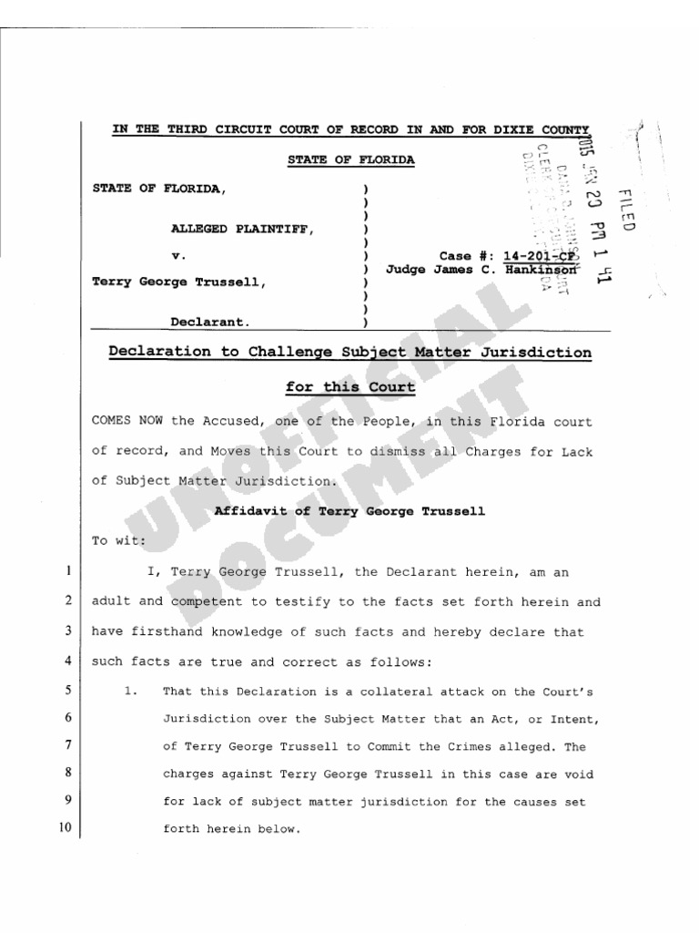 01202015 Declaration to Challenge Subject Matter Jurisdiction for