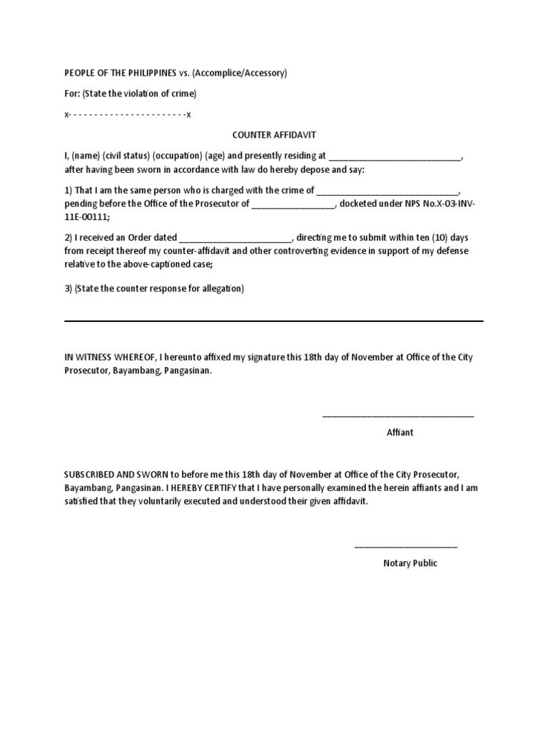 Counter Affidavit Template - Create, customize, and download counter affidavits with ease. Republic of the philippines department of justice office of the city prosecutor baguio city anna rose santos, complainan. 1) three respondents, leodan bustarde, clea lagatao, and jojo. Find a wide range of counter affidavit forms and templates for various legal purposes. Legal basis for filing and verification procedures 3.1. Counter affidavit of the 1st, 2nd, 3rd and 4th respondents in opposition to the applicant’s originating motion on notice dated 24th day of february, 2016 It should focus on the specific points raised in the complaint or. Counter affidavit format for high court. A counter affidavit is an opportunity to present your side of the story and refute the allegations made against you. Counter affidavit and summons (small claims) approved board of justice court judges september 22, 2010 revised may 10, 2017 page 4 of 5 summons to: The counter affidavit is a response to an affidavit submitted by the plaintiff and. 1) three respondents, leodan bustarde, clea lagatao, and jojo. Legal basis for filing and verification procedures 3.1. Up to $50 cash back a sample counter affidavit is a legal document submitted by a defendant in a court case. It should focus on the specific points raised in the complaint or. Reply to be filed in high court against petition filed by a party. Counter affidavit of the 1st, 2nd, 3rd and 4th respondents in opposition to the applicant’s originating motion on notice dated 24th day of february, 2016 Counter affidavit format for high court. Republic of the philippines department of justice office of the city prosecutor baguio city anna rose santos, complainan. Find a wide range of counter affidavit forms and templates for various legal purposes. A counter affidavit is an opportunity to present your side of the story and refute the allegations made against you. Counter affidavit format for high court. Republic of the philippines department of justice office of the city prosecutor baguio city anna rose santos, complainan. Get everything done in minutes. Reply to be filed in high court against petition filed by. Reply to be filed in high court against petition filed by a party. It should focus on the specific points raised in the complaint or. A counter affidavit is an opportunity to present your side of the story and refute the allegations made against you. Republic of the philippines department of justice office of the city prosecutor baguio city anna. Find a wide range of counter affidavit forms and templates for various legal purposes. Counter affidavit format for high court. The counter affidavit is a response to an affidavit submitted by the plaintiff and. Counter affidavit of the 1st, 2nd, 3rd and 4th respondents in opposition to the applicant’s originating motion on notice dated 24th day of february, 2016 1). Counter affidavit and summons (small claims) approved board of justice court judges september 22, 2010 revised may 10, 2017 page 4 of 5 summons to: Up to $50 cash back a sample counter affidavit is a legal document submitted by a defendant in a court case. A counter affidavit is an opportunity to present your side of the story and. The counter affidavit is a response to an affidavit submitted by the plaintiff and. Create, customize, and download counter affidavits with ease. Involving estafa undergoing preliminary investigation bef. It should focus on the specific points raised in the complaint or. Up to $50 cash back a sample counter affidavit is a legal document submitted by a defendant in a court. Reply to be filed in high court against petition filed by a party. Legal basis for filing and verification procedures 3.1. Get everything done in minutes. Republic of the philippines department of justice office of the city prosecutor baguio city anna rose santos, complainan. The counter affidavit is a response to an affidavit submitted by the plaintiff and. Counter affidavit of the 1st, 2nd, 3rd and 4th respondents in opposition to the applicant’s originating motion on notice dated 24th day of february, 2016 1) three respondents, leodan bustarde, clea lagatao, and jojo. The counter affidavit is a response to an affidavit submitted by the plaintiff and. It should focus on the specific points raised in the complaint or.. Counter affidavit and summons (small claims) approved board of justice court judges september 22, 2010 revised may 10, 2017 page 4 of 5 summons to: Check out how easy it is to complete and esign documents online using fillable templates and a powerful editor. Counter affidavit of the 1st, 2nd, 3rd and 4th respondents in opposition to the applicant’s originating. Find a wide range of counter affidavit forms and templates for various legal purposes. Get everything done in minutes. The counter affidavit is a response to an affidavit submitted by the plaintiff and. Check out how easy it is to complete and esign documents online using fillable templates and a powerful editor. Up to $50 cash back a sample counter. Counter affidavit of the 1st, 2nd, 3rd and 4th respondents in opposition to the applicant’s originating motion on notice dated 24th day of february, 2016 Legal basis for filing and verification procedures 3.1. Get everything done in minutes. Involving estafa undergoing preliminary investigation bef. Up to $50 cash back a sample counter affidavit is a legal document submitted by a. Create, customize, and download counter affidavits with ease. 1) three respondents, leodan bustarde, clea lagatao, and jojo. Republic of the philippines department of justice office of the city prosecutor baguio city anna rose santos, complainan. Up to $50 cash back a sample counter affidavit is a legal document submitted by a defendant in a court case. The counter affidavit is a response to an affidavit submitted by the plaintiff and. A counter affidavit is an opportunity to present your side of the story and refute the allegations made against you. Leg