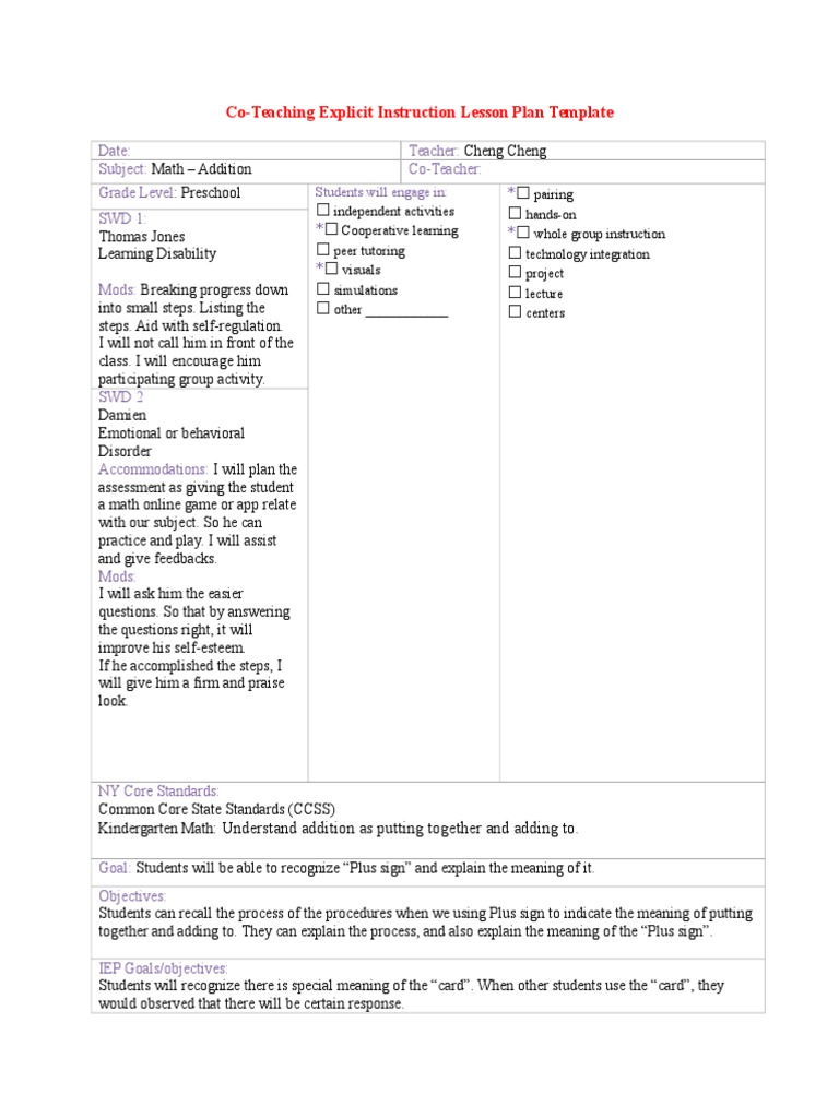 CoTeaching Explicit Instruction Lesson Plan Template Date Teacher