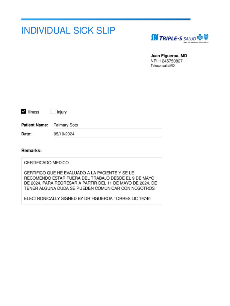 Sick Slip Tal Mary PDF