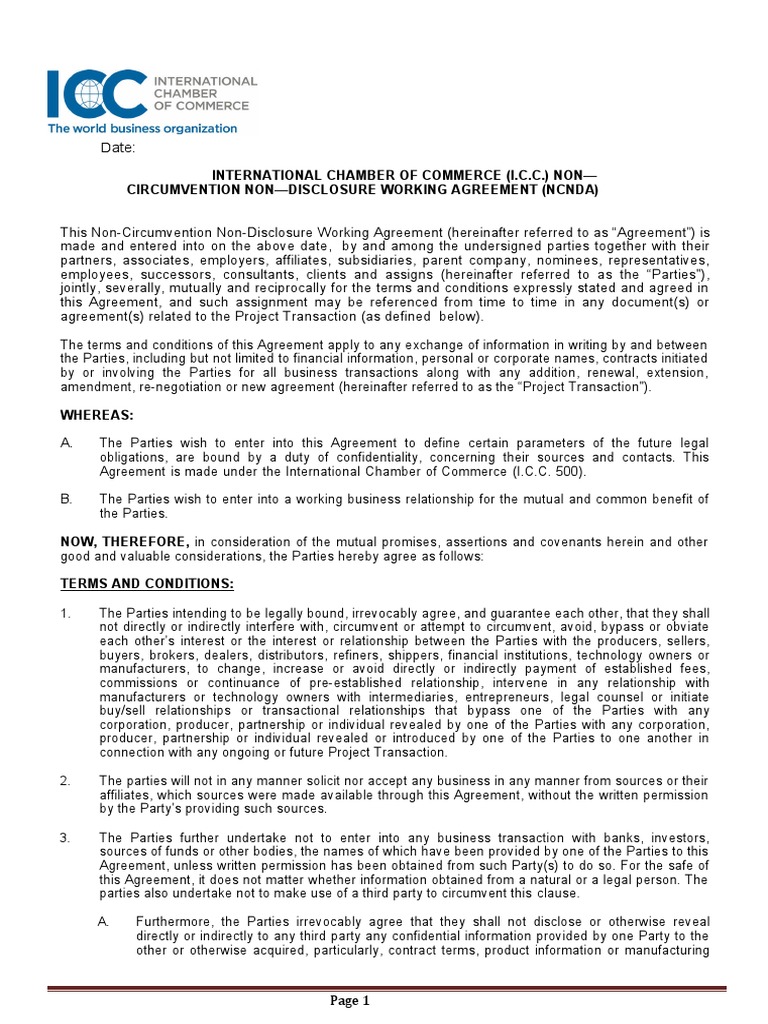 Date International Chamber of Commerce (I.C.C.) Non Circumvention