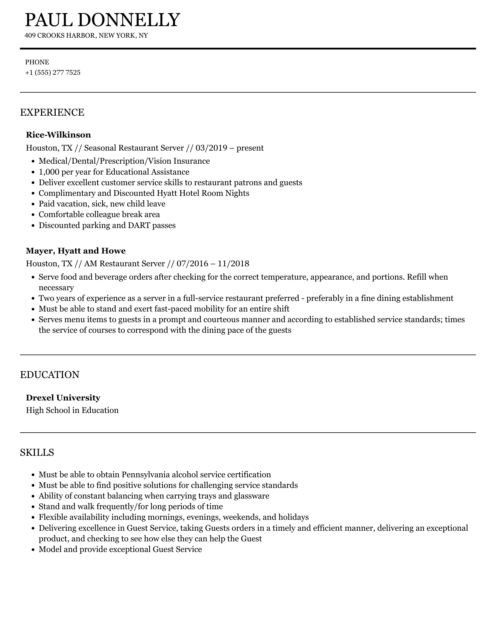 Restaurant Server Resume Template - Browse our full library of resume templates. Explore professionally designed server resume templates that are free, customizable, and printable. As a restaurant server, key responsibilities include delivering exceptional customer service, managing orders, and ensuring a smooth dining experience. 19 restaurant service resume examples found. Dreaming of landing that perfect restaurant server position? A server resume must display that your skills and experience can help the. Seeking a new serving position? Every sample is created and approved by our team of certified professional resume writers. Check out this sample to see how you can serve up your skills to potential employers. Your resume can be your meal ticket to a great new restaurant server job, so be sure it's shows. As a restaurant server, key responsibilities include delivering exceptional customer service, managing orders, and ensuring a smooth dining experience. Your journey starts with crafting an outstanding restaurant server resume. Seeking a new serving position? In this article, discover expert tips, tricks,. Download sample resume templates in pdf, word formats. Every sample is created and approved by our team of certified professional resume writers. Dreaming of landing that perfect restaurant server position? A server resume must display that your skills and experience can help the. The best restaurant server resume examples with headline, objective statement, description and skills. Your restaurant server resume should include these sections: The best restaurant server resume examples with headline, objective statement, description and skills. A server resume must display that your skills and experience can help the. All examples are written by certified resume experts, and free for personal use. Browse our full library of resume templates. In this article, discover expert tips, tricks,. Our restaurant server resume example and expert tips will help you create the perfect resume to get the job you want. If you're applying for an restaurant server position, it's important to tailor your resume to the specific job requirements in order to differentiate yourself. Explore resumonk's handpicked resume examples to understand the art of leaving a lasting mark. Dreaming. Every sample is created and approved by our team of certified professional resume writers. Explore professionally designed server resume templates that are free, customizable, and printable. Your journey starts with crafting an outstanding restaurant server resume. A server resume must display that your skills and experience can help the. Browse our full library of resume templates. Your resume can be your meal ticket to a great new restaurant server job, so be sure it's shows. Explore resumonk's handpicked resume examples to understand the art of leaving a lasting mark. Dreaming of landing that perfect restaurant server position? Copy any of the restaurant service resume examples to. Learn how to highlight your skills, experience, and qualifications to. Every sample is created and approved by our team of certified professional resume writers. 19 restaurant service resume examples found. Scroll to the bottom for a restaurant server sample resume to garnish your own. Seeking a new serving position? Copy any of the restaurant service resume examples to. Copy any of the restaurant service resume examples to. Learn how to highlight your skills, experience, and qualifications to. Your resume can be your meal ticket to a great new restaurant server job, so be sure it's shows. Provide your full name, phone number, email address, city, state, and any. Scroll to the bottom for a restaurant server sample resume. Seeking a new serving position? If you're applying for an restaurant server position, it's important to tailor your resume to the specific job requirements in order to differentiate yourself. Scroll to the bottom for a restaurant server sample resume to garnish your own. When applying for a restaurant position, showcasing the right set of server skills for resume can significantly. As a restaurant server, key responsibilities include delivering exceptional customer service, managing orders, and ensuring a smooth dining experience. All examples are written by certified resume experts, and free for personal use. Explore resumonk's handpicked resume examples to understand the art of leaving a lasting mark. Learn how to highlight your skills, experience, and qualifications to. Your resume can be. Seeking a new serving position? Explore professionally designed server resume templates that are free, customizable, and printable. Dreaming of landing that perfect restaurant server position? Browse our full library of resume templates. Our restaurant server resume example and expert tips will help you create the perfect resume to get the job you want. 19 restaurant service resume examples found. Scroll to the bottom for a restaurant server sample resume to garnish your own. Your restaurant server resume should include these sections: Explore resumonk's handpicked resume examples to understand the art of leaving a lasting mark. Learn how to highlight your skills, experience, and qualifications to. Your restaurant server resume should include these sections: All examples are written by certified resume experts, and free for personal use. Provide your full name, phone number, email address, city, state, and any. If you're applying for an restaurant server position, it's important to tailor your resume to the specific job requirements in order to differentiate yourself. Download sample resume templates in pdf, word formats. Your journey starts with crafting an outstanding restaurant server resume. Scroll to the bottom for a restaurant server sample resume to garnish your own. Browse our full library of resume templates. Dreaming of landing that perfect restaurant server position? The best restaurant server resume examples with headline, obj